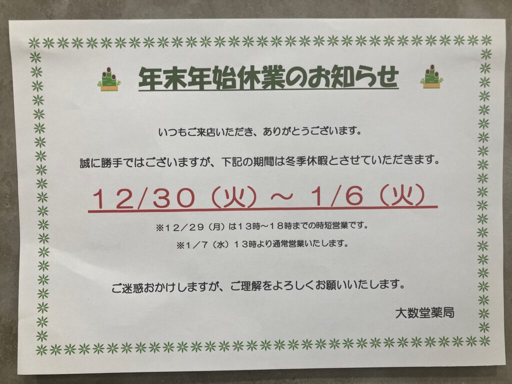 年末年始の営業についてお知らせいたします。